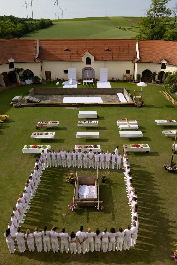 A perfect example of this is in the performance by Hermann Nitsch titled “The Orgies Mysteries Theatre (1962)” which is a sort of recurring violent ritual festival, mockery of Christ and Dionysian/ Bataillian orgy with bloody animal carcasses and naked participants, most recently held in a former monastery. Nitsch had been charged under obscenity and indecency laws, but his ritual violence is not an anomaly in the post-modern art world (Marina Abramovic apparently attended one of these events). Additionally, the work of artists who destroy classic works, such as Jake and Dinos Chapman who defaced rare prints by Goya as part of an installation. Their artwork centres largely on themes of Nazi imagery and war, mutilated mannequins, consumerist iconography and obviously, pornographic, sacrilegious accelerationism. This spite and mockery is a response to being morally convicted by beauty. The slippery slope of rejecting traditional methods of art and questioning “structures of thought” to performance art centred on violent, perverted acts of depravity was extremely fast because at the heart of it is a rejection of God, and embracing of Hell as the utter absence of God. This lends an explanation as to why sacrilege and paganism seeps into the modern artist’s work and why the slow erasure of beauty in our art, architecture, décor, fashion etc. is a spiritual death by a thousand cuts.